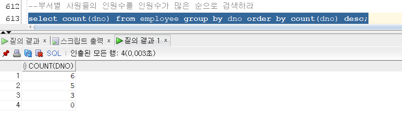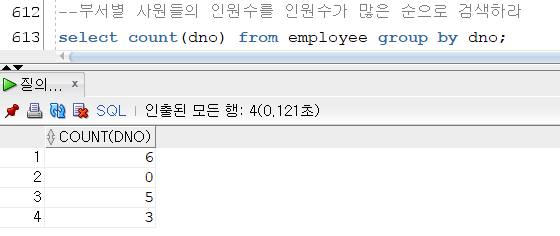 group by dno 뒤에 ordey by (이렇게 정렬할거야) - 누구를? count(dno)- > 카운트한 인원을 -> desc(오름차순) 으로!